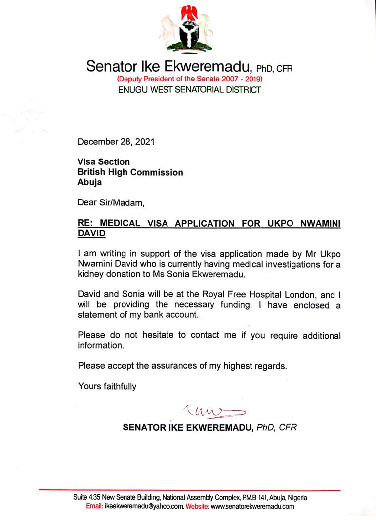 The Lagosian can confirm that Senator Ike Ekwerenmadu informed the British Consulate of his intention to bring a donor to Britain in order to save his ailing daughter.