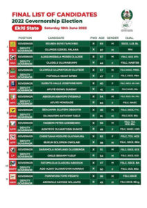 The Independent National Electoral Commission (INEC) has published the final list of candidates for the Ekiti governorship election slated for June 18.