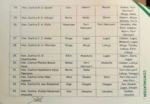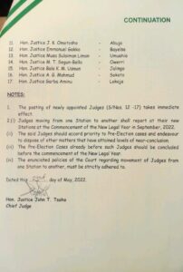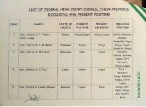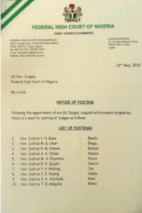 In a letter signed by Chief Justice of the Federal High Court Hon. John T. Tsoho, the postings take immediate effect.