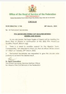 According to a circular from the Office of the Head of Service of the Federation and signed by Dr. Ngozi Onwudiwe, Permanent Secretary (Service Welfare Office) the directive is to enable all workers mobilize support for the Super Eagles of Nigeria ahead of their crunch World Cup Qualifiers clash against the Black Stars of Ghana.