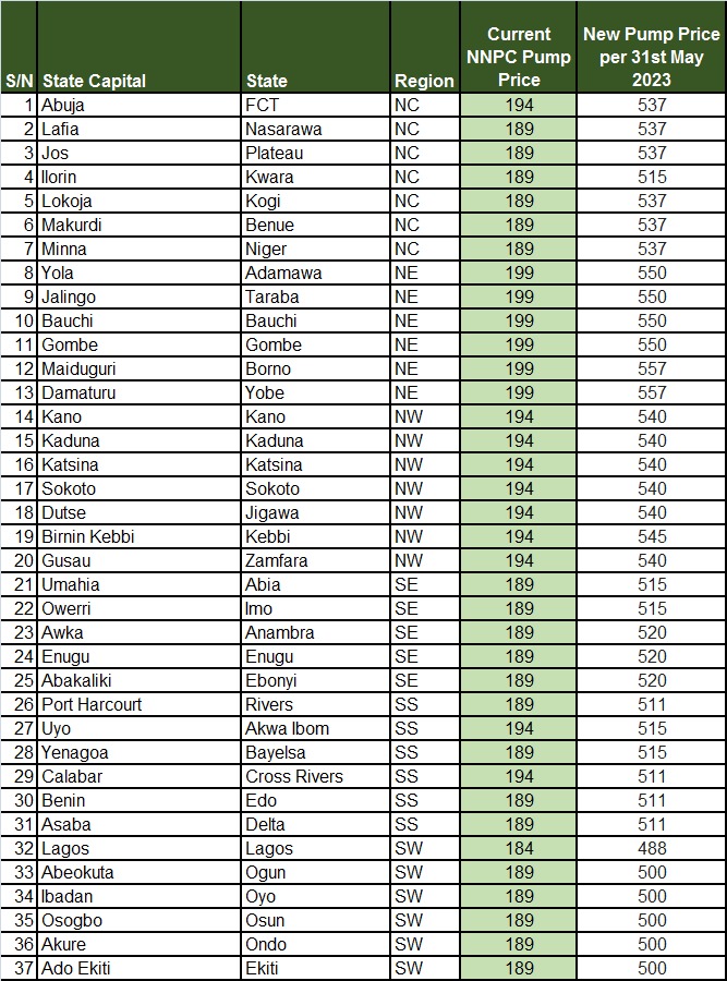Under the new price regime, the NNPC station in Oyo will retail the product at N500, Kano at N540, Ogun and Edo at N511, and Akwa Ibom at N515.