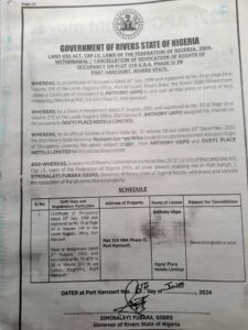 The Rivers State Governor, Siminalayi Fubara has cancelled the revocation of of the Certificate of Occupancy of Le Meridien hotel, a property of Ogeyi Place Hotels Limited belonging to Brigadier General Anthony Ukpo (Rtd).